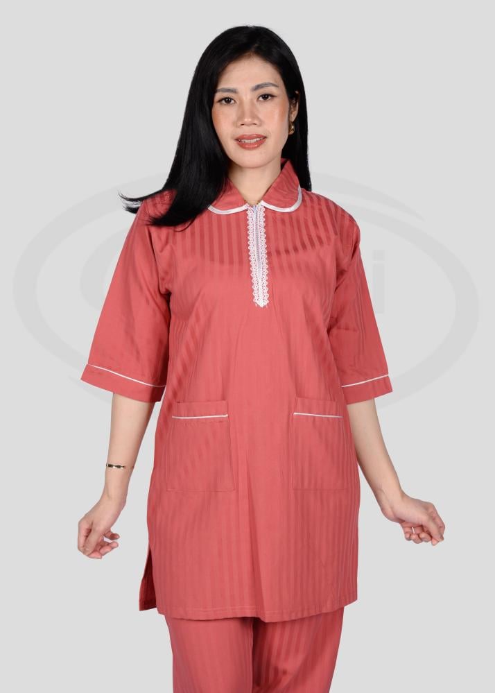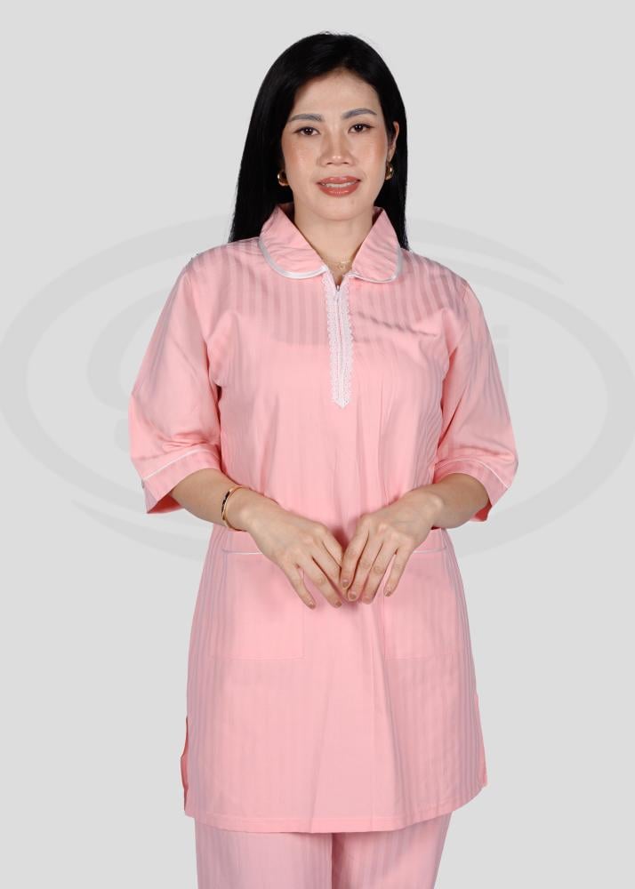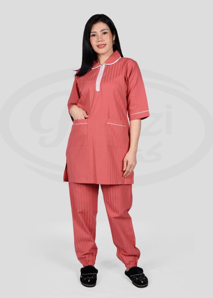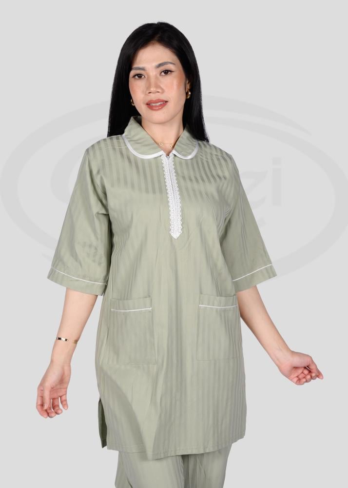 زيّ عاملات بتصميم عملي وأنيق مصنوع من خامة قطنية 100% عالية الجودة، يتميز بملمسه الناعم وتهويته الممتازة التي تمنح راحة فائقة طوال ساعات الارتداء. صُمم الزي بقصة فضفاضة وانسيابية تسمح بحرية الحركة وسهولة الأداء، مع ياقة أنيقة تضيف لمسة مرتبة واحترافية للمظهر. يحتوي الجزء العلوي على جيوب أمامية واسعة توفر مساحة عملية لحمل المستلزمات الضرورية، كما أن تفاصيل الخياطة الدقيقة تمنحه مظهرًا مرتبًا يعكس العناية بالجودة والتصميم.