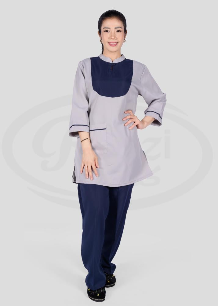 استمتعي بالراحة والأناقة أثناء أداء مهامك اليومية مع زي العاملات المنزلي الجديد بتصميم بلونين. بينما البنطال الواسع يأتي بلون موحد. يتميز الزي بأكمام ثلاثية الطول، فتحة رقبة صغيرة بستايل عصري، وجيب عملي على الجهة اليمنى. مثالي للعاملات المنزلية.