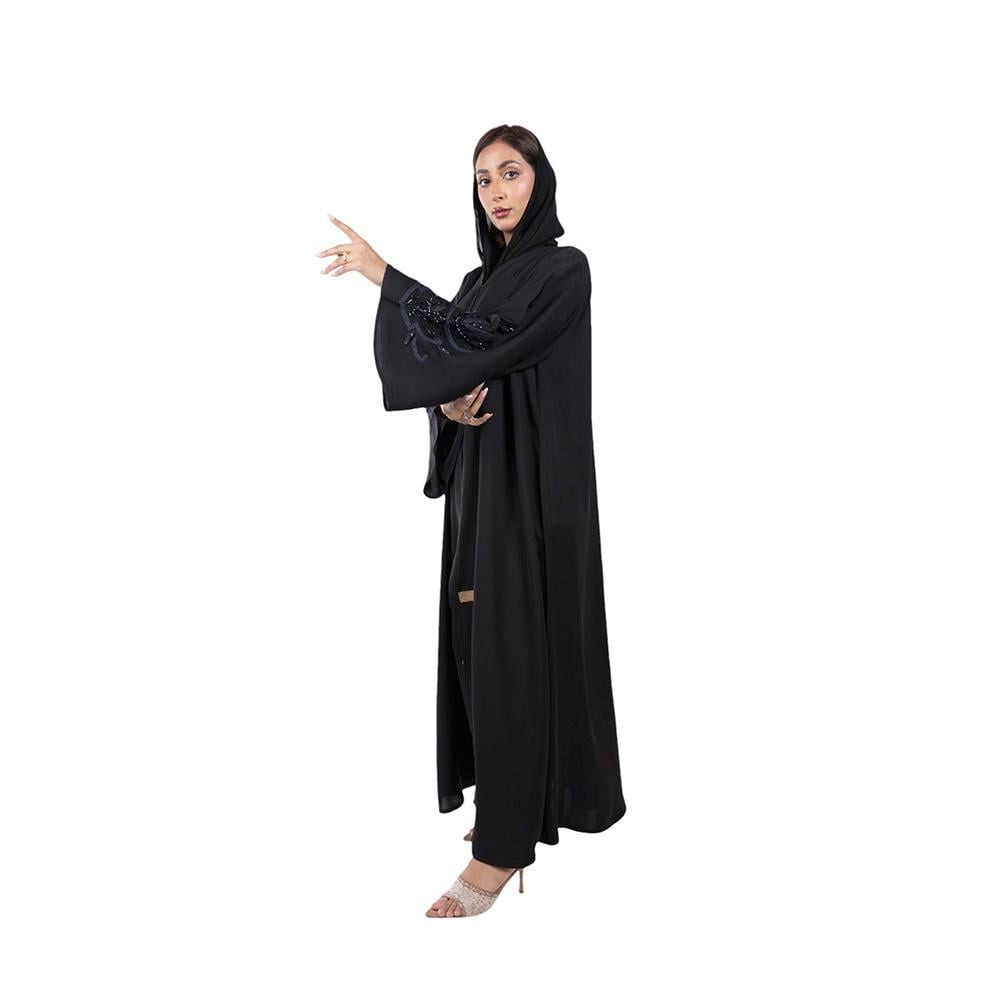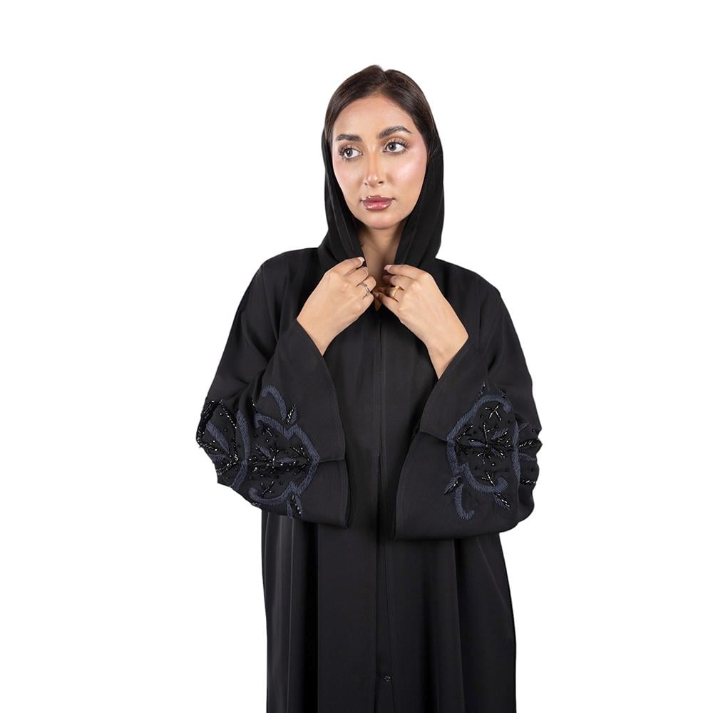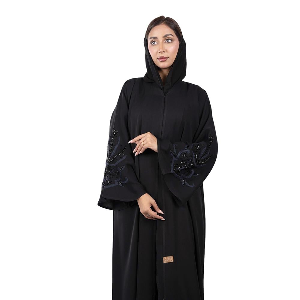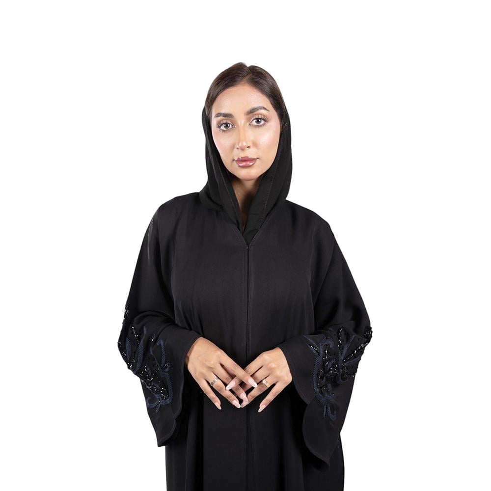التطريز: تطريز كحلي وخرز أسود لامع على كم العباية