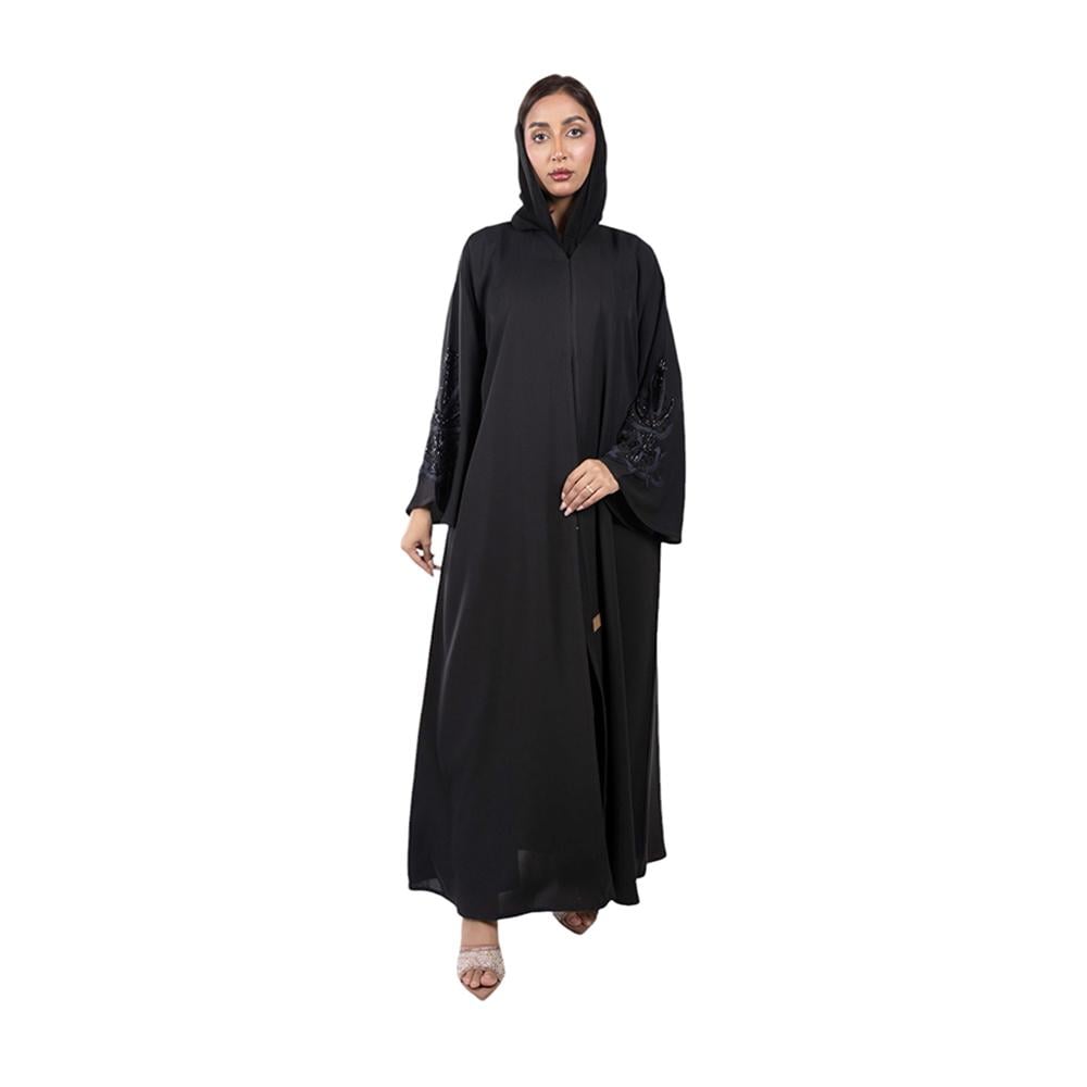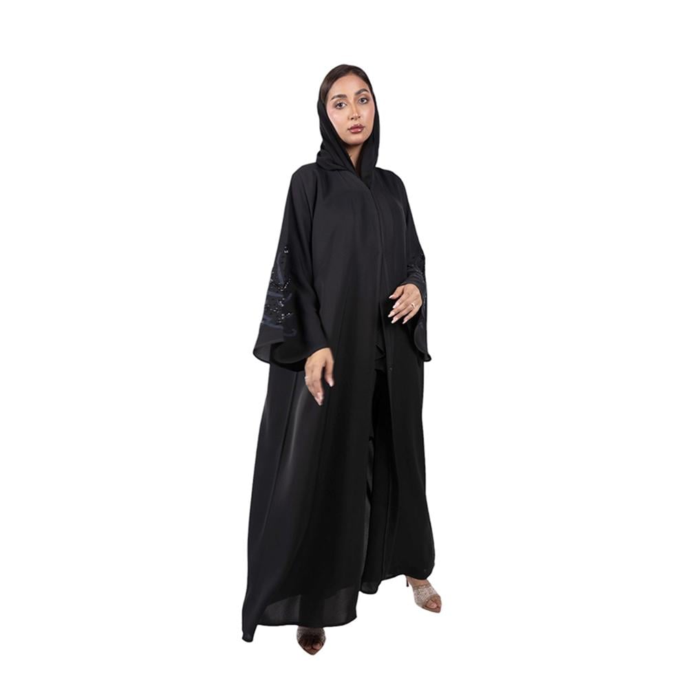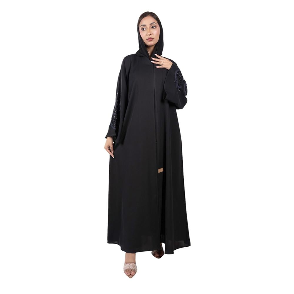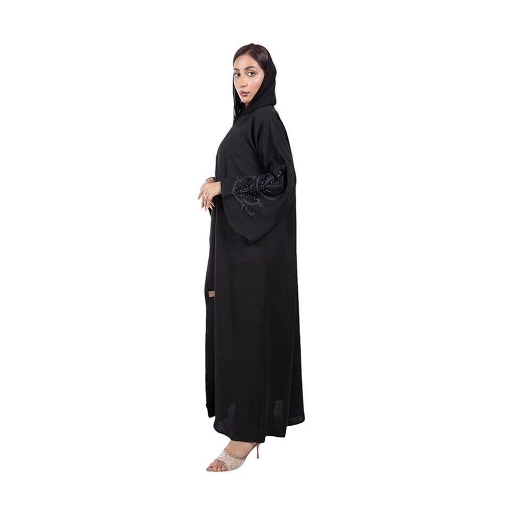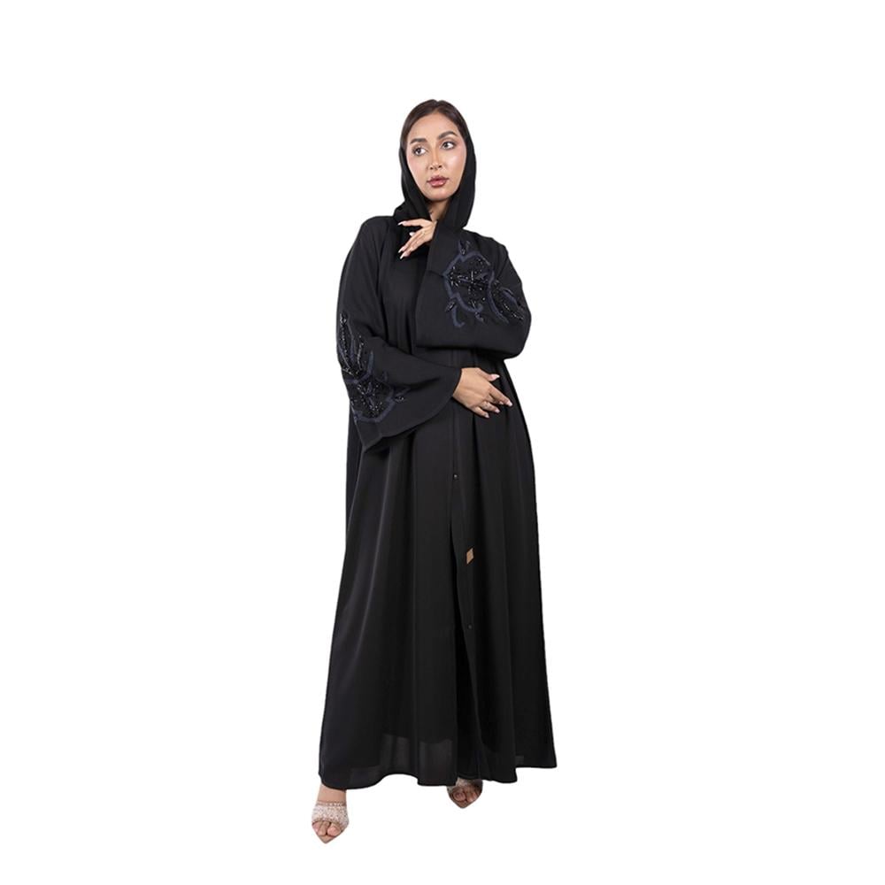 التطريز: تطريز كحلي وخرز أسود لامع على كم العباية