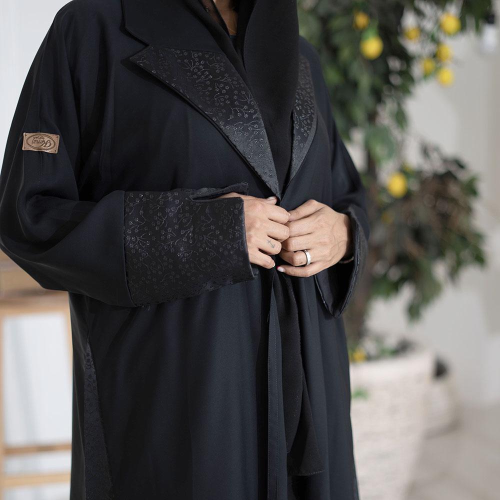 عباية سوداء لف كريب انترنت بليزر مع تدخيلات قماش جاكار باللون الاسود مع طرحه ساده سوداء