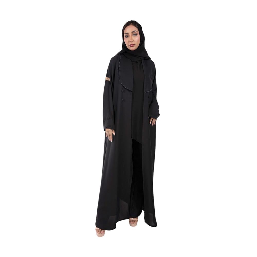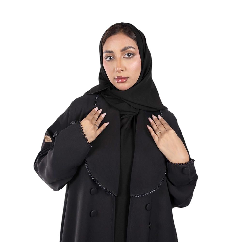 عباية كريب انترنت سوداء بليزر مزين بحبات اللؤلؤ الاسود مع طرحه F