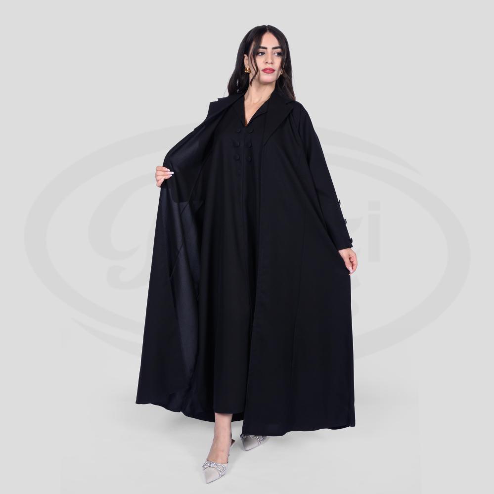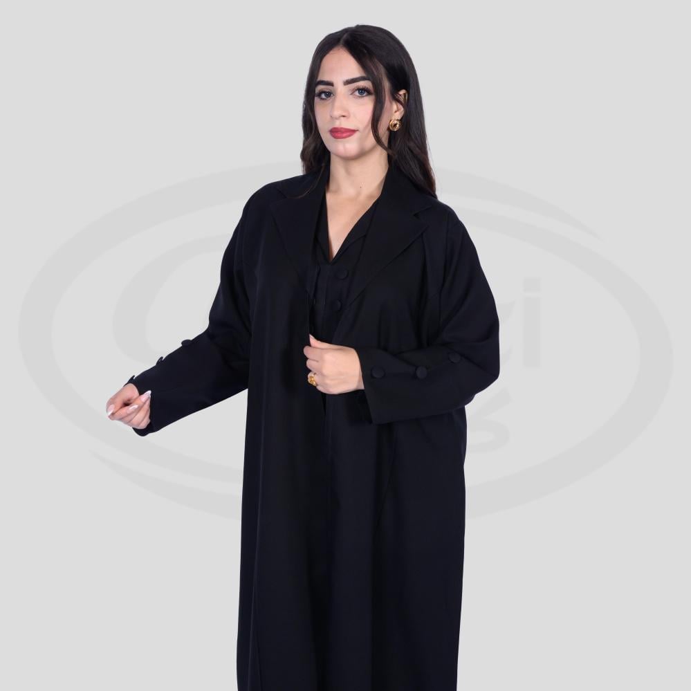 قصة مميزة انسيابية مريحة باللبس مع أزارير في أكمام العباية و ياقة مفتوحة