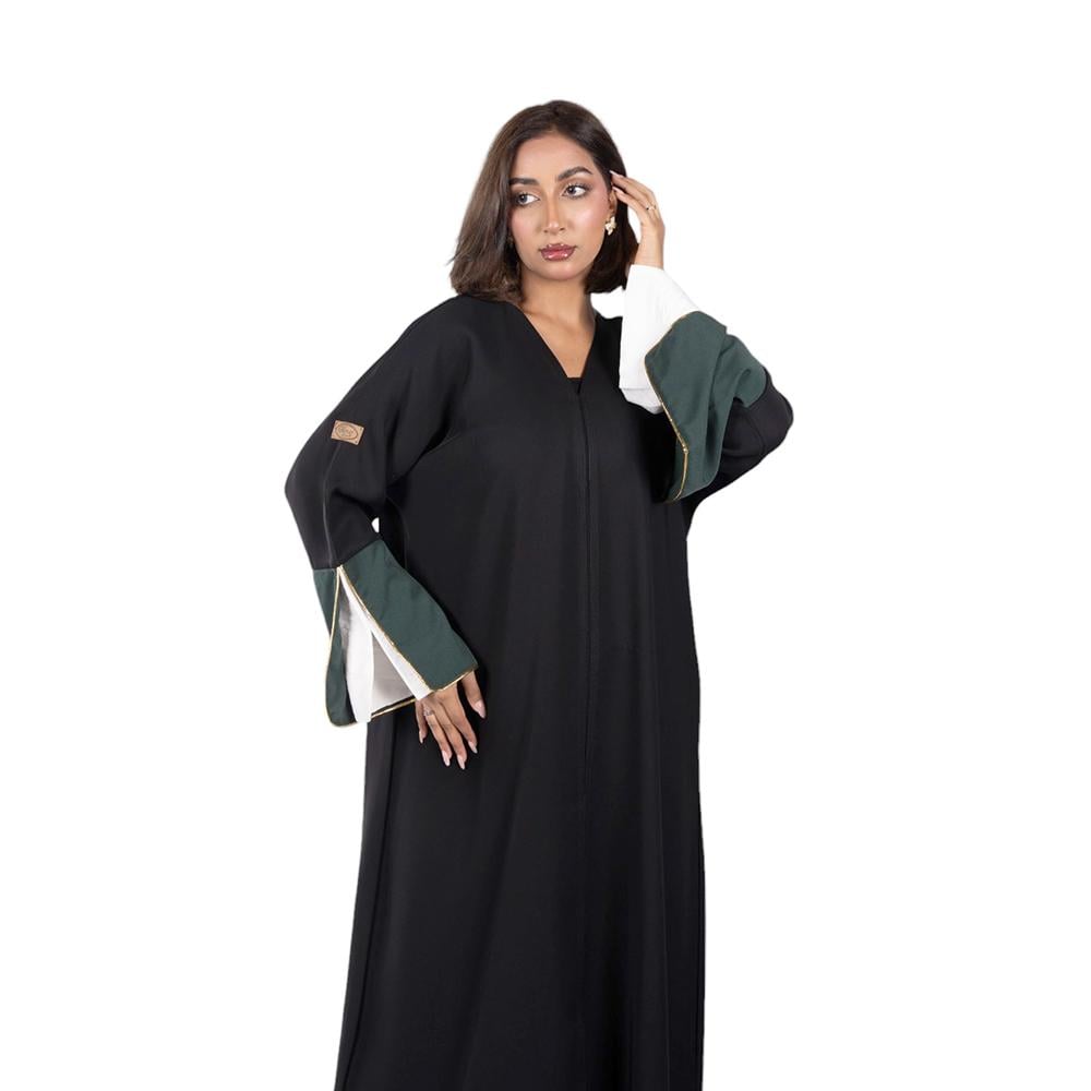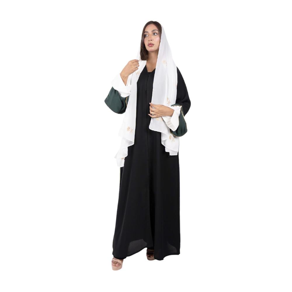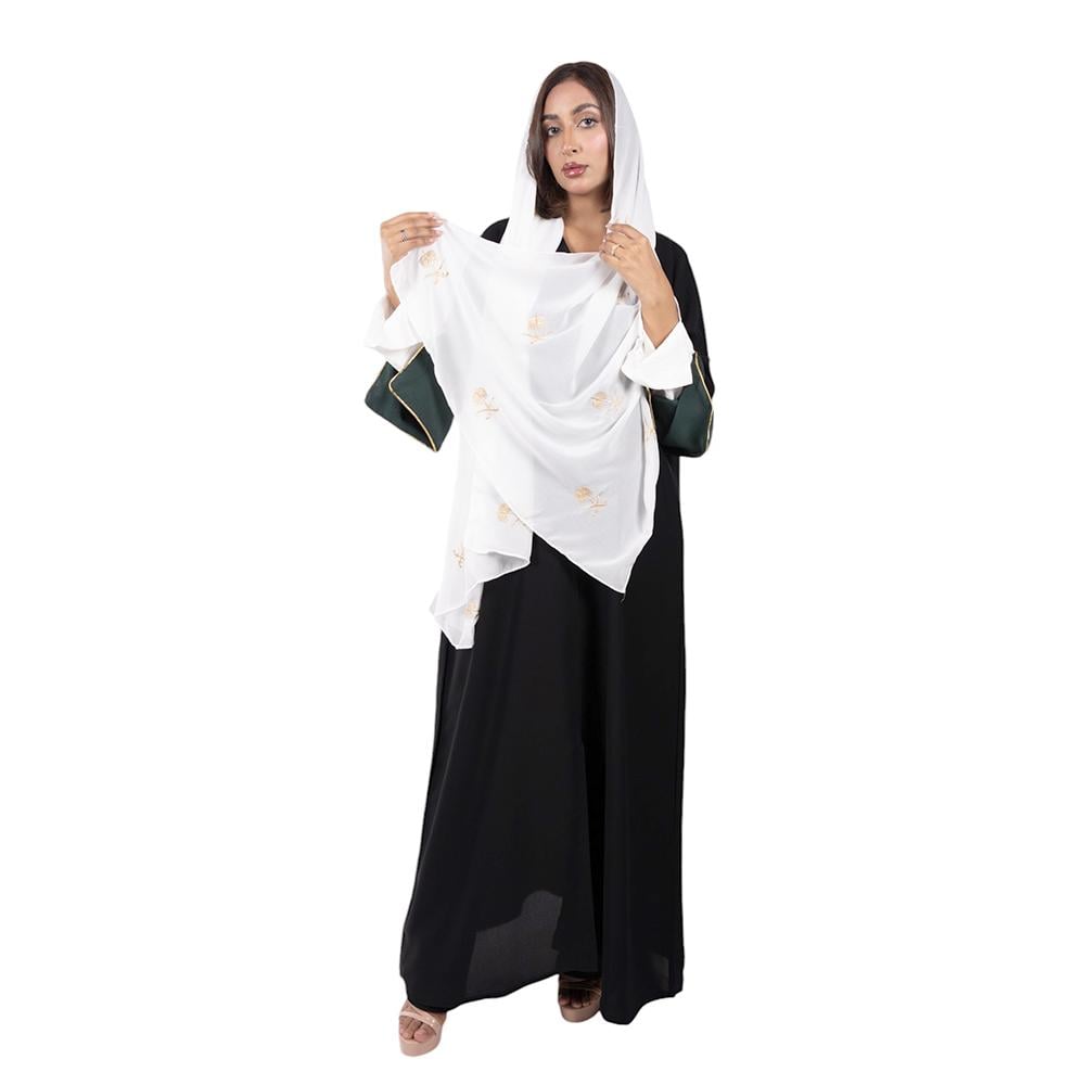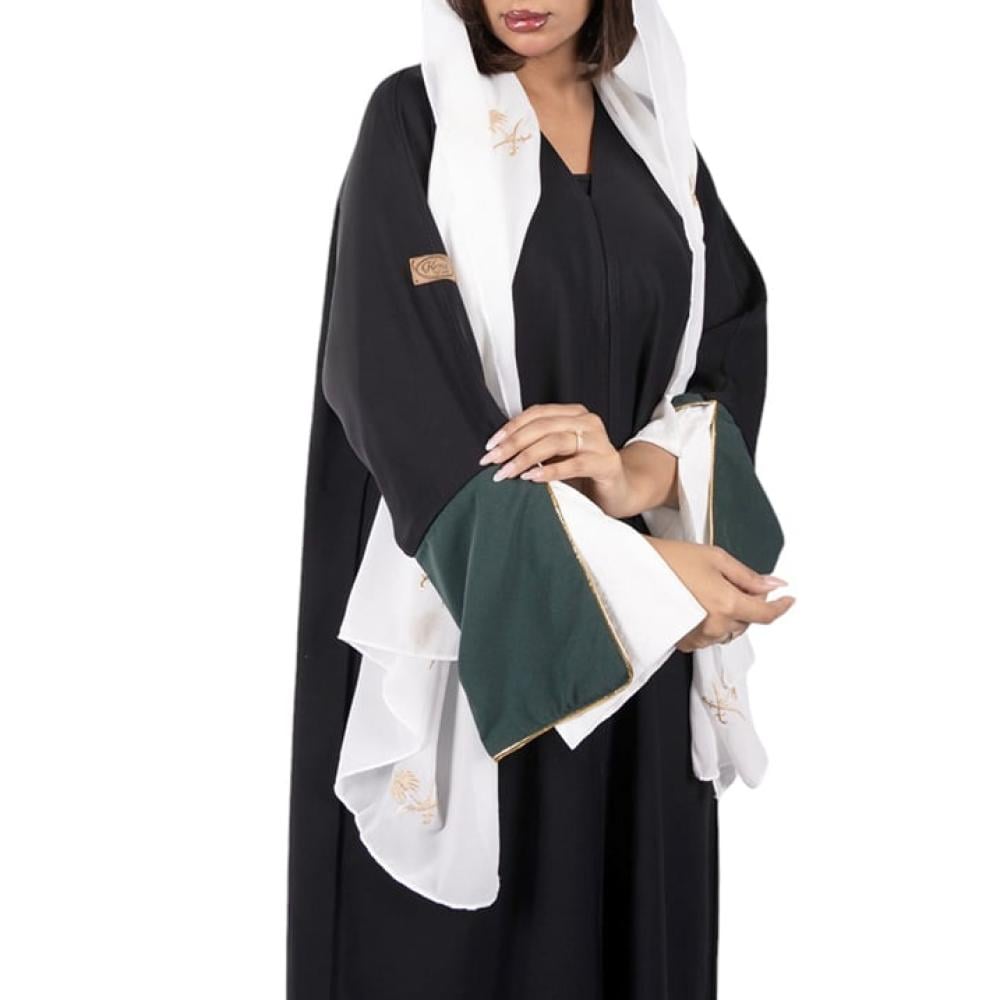 عباية ربع كلوش سوداء بلاك بيري بأكمام ملونة اخضر وابيض مع طرحة بيضاء بشعار سيفين ونخله