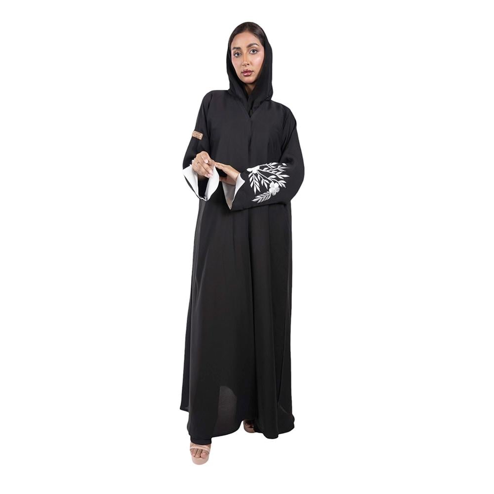 عباية سوداء كريب انترنت قصة كلوش بكم مفتوح مطرز و مبطن بالأبيض مع طرحه