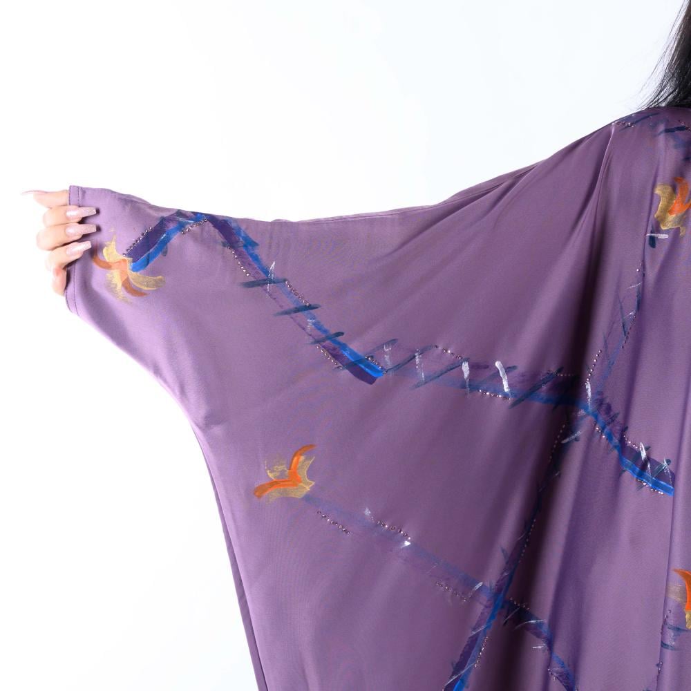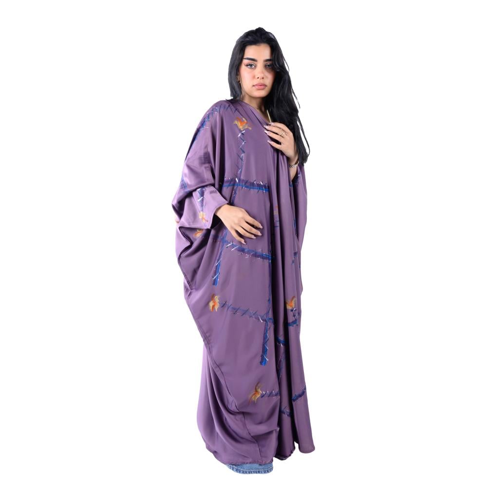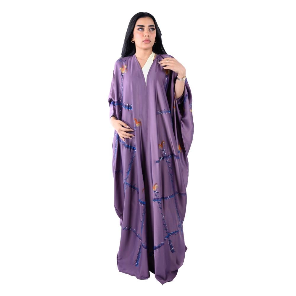 عباية لف فراشة بلون بنفسجي مطرز بالوان متنوعه خامتها كريب مغسول F