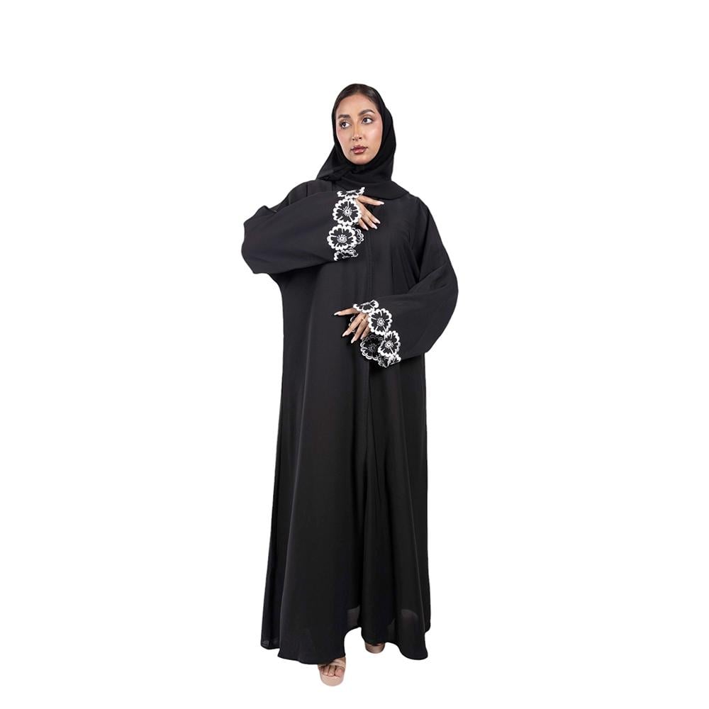 عباية كريب انترنت سوداء كلوش بكم وسيع مطرز زهور أبيض على الطرف مع طرحه
