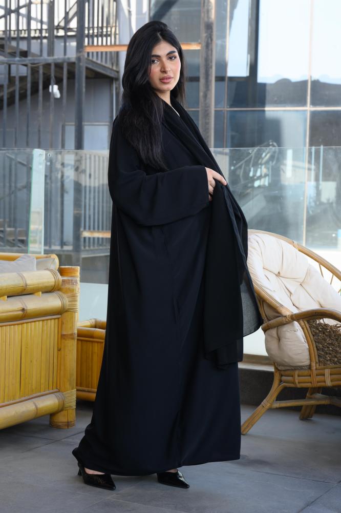 عباية نسائية بتصميم مفتوح بالكامل بدون أزرار أو سحاب، تتميز بقصة واسعة تمنح الراحة والانسيابية. ياقة وسيعة بينما تنسدل الأكمام الطويلة بشكل طبيعي ومريح. الخياطة النظيفة والتفاصيل الدقيقة تجعلها قطعة عملية ومناسبة لتنسيقات متعددة.