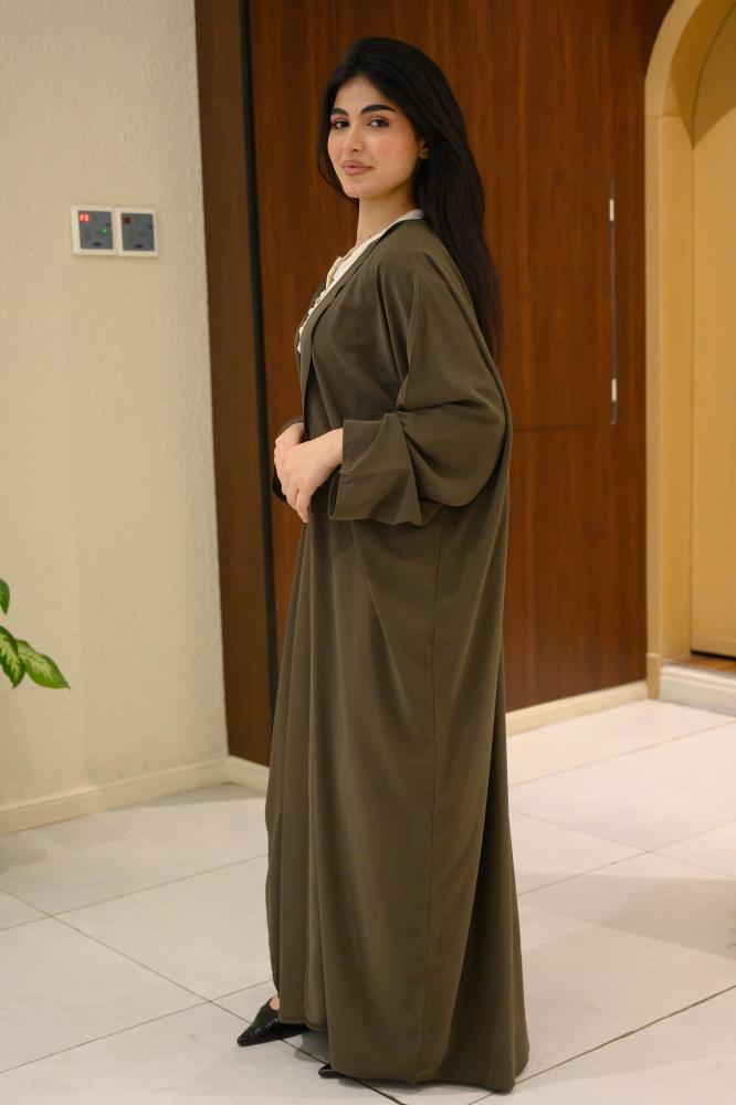 عبايه ساده مفتوحه بلون زيتي خامه كريب حرير