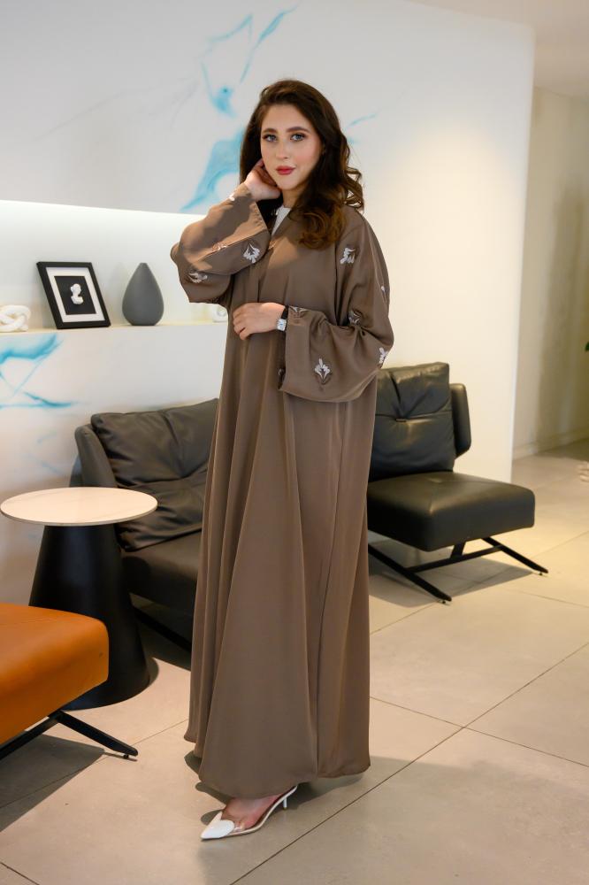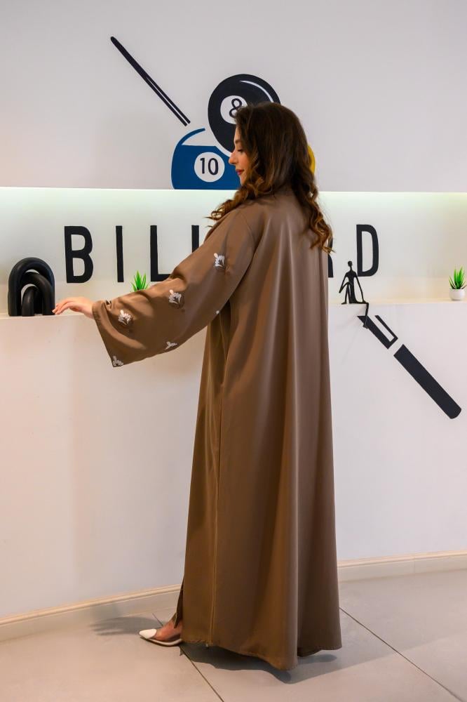 عبايه بني ترابي بتطريز أنيق على الاكمام