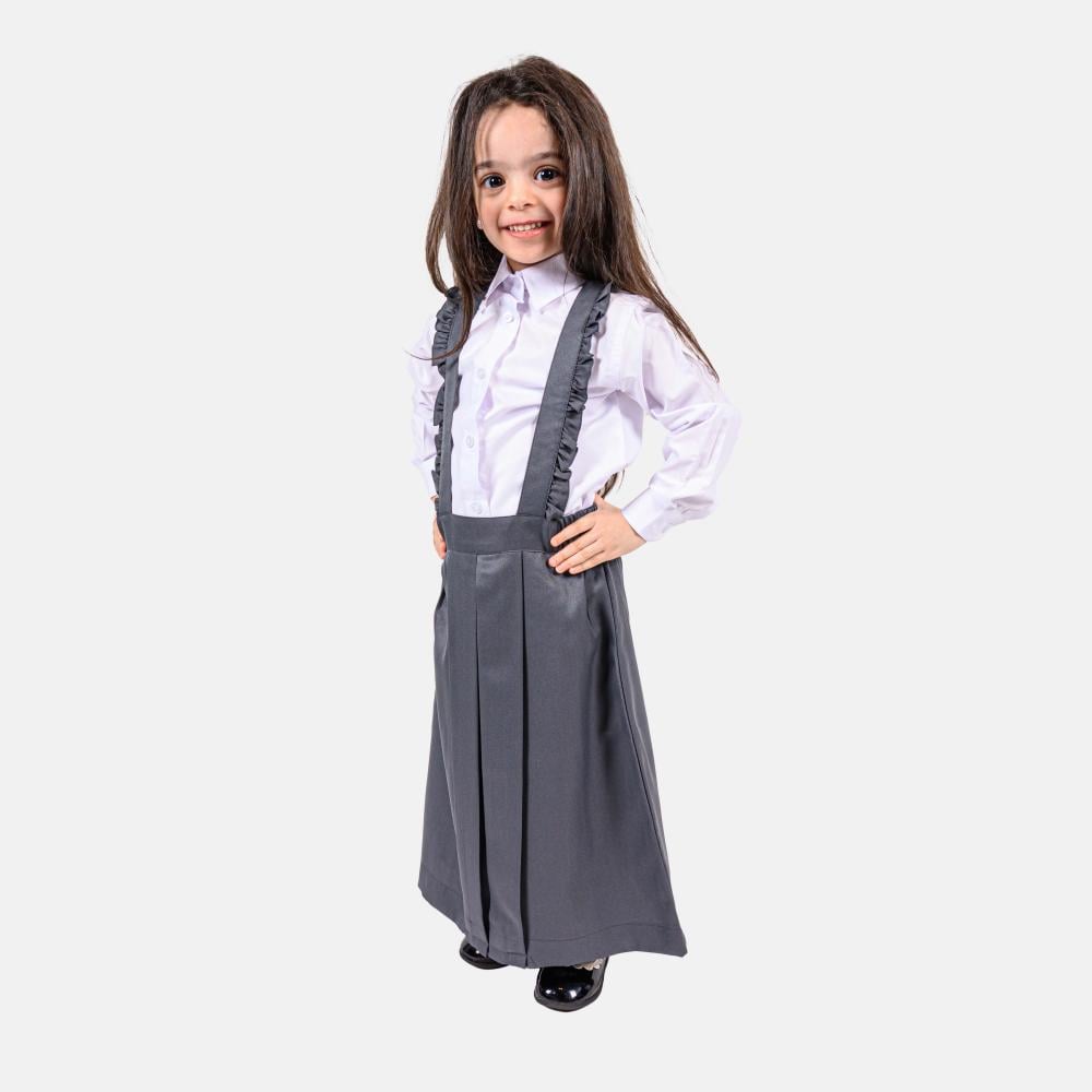 مريول روضة بناتي بتصميم فريد وأنيق، يأتي بلون رصاصي هادئ مع حمالات طويلة مزينة بكشكش على الجانبين لإطلالة طفولية مميزة. يتميز بقصة مريحة مع كسرات أمامية تسمح بحرية الحركة، مما يجعله خيارًا مثاليًا لأيام الروضة الطويلة.