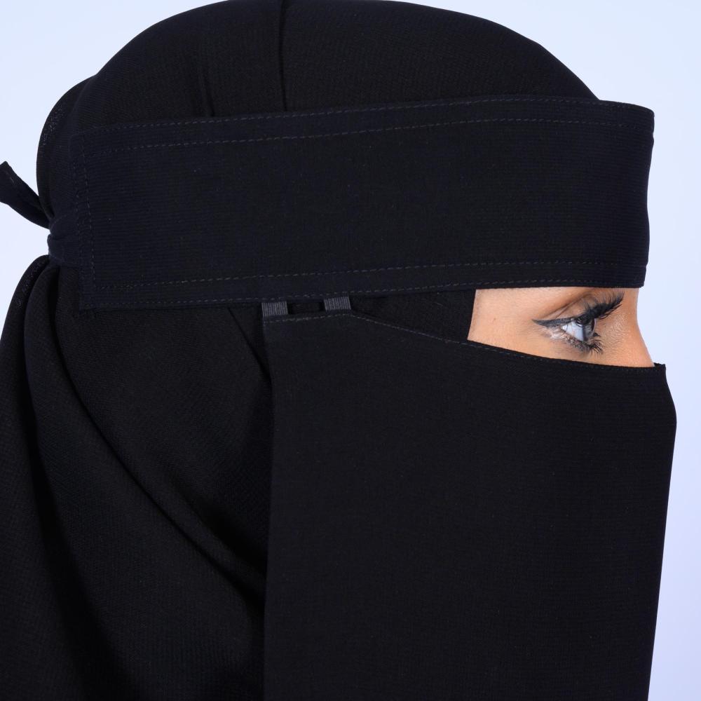 يتخذ النقاب شكلًا مستطيلاً ، ويثبت على الرأس بواسطة رباط من الخلف