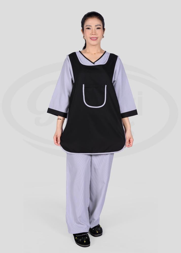 زي عاملات منزلية مكون من ثلاث قطع مصمم خصيصًا لتلبية احتياجات العاملات المنزليات في الأجواء الصيفية، مع الحفاظ على المظهر الأنيق والعملية.