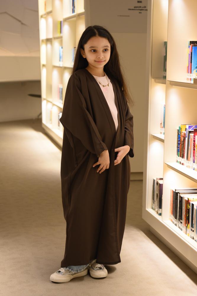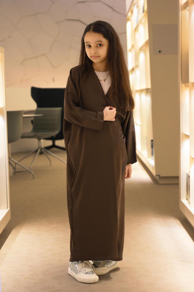 عباية بناتي بتصميم مفتوح بالكامل بدون أزرار أو سحاب، تتميز بقصة واسعة تمنح الراحة والانسيابية. ياقة وسيعة بينما تنسدل الأكمام الطويلة بشكل طبيعي ومريح. الخياطة النظيفة والتفاصيل الدقيقة تجعلها قطعة عملية ومناسبة لتنسيقات متعددة.